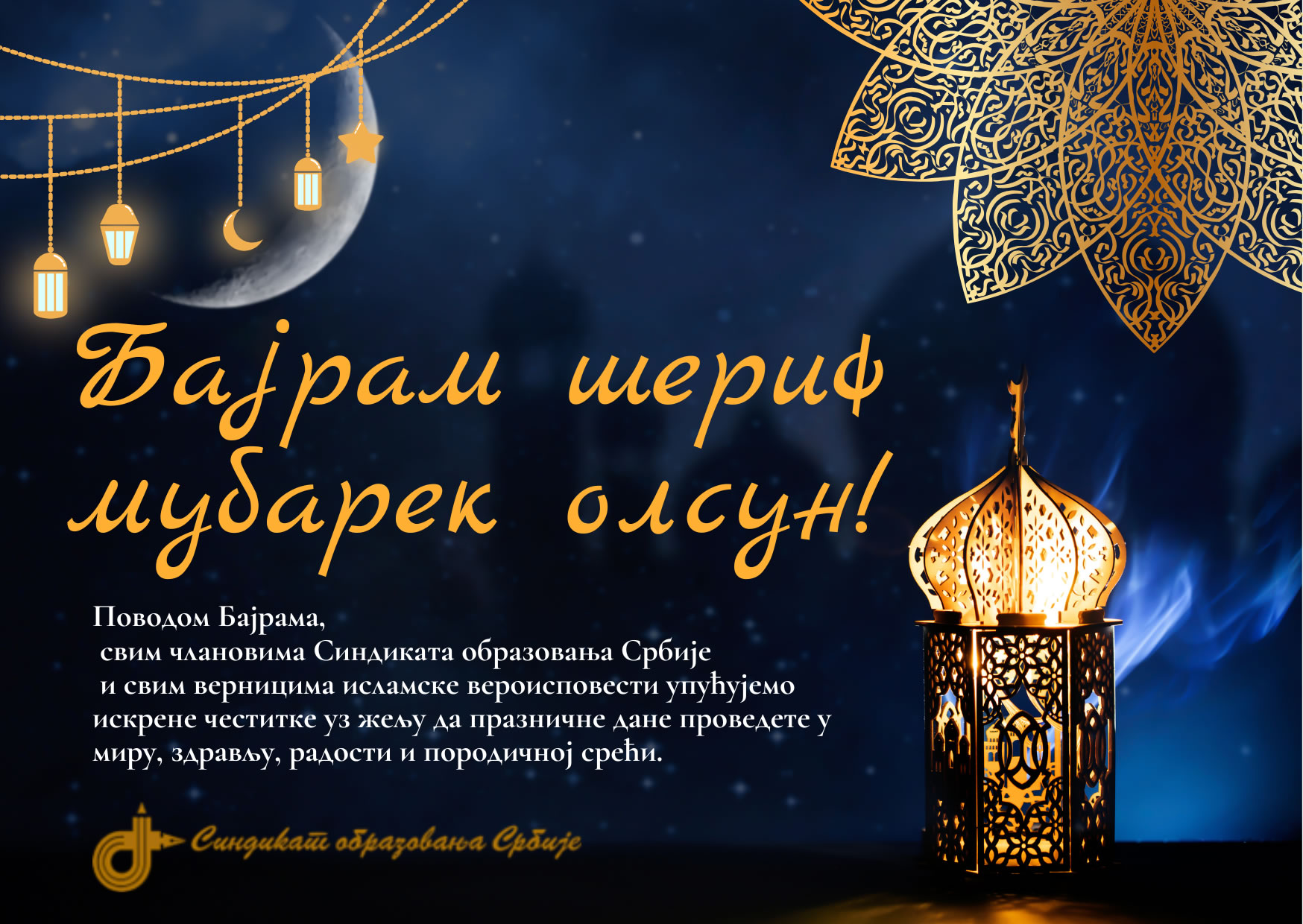 Поводом великог празника Бајрама, свим члановима Синдиката образовања Србије, колегиницама и колегама, као и свим верницима исламске вероисповести, упућујем искрене и срдачне честитке.