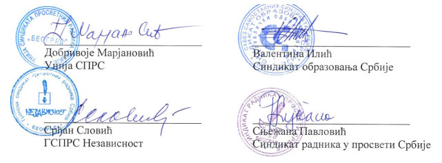 Репрезентативни синдикати у просвети неће подржати мере које нису засноване на струци, закону и најбољем интересу ученика и запослених у образовању и настави и наставиће да користе сва законом дозвољена средства у заштити професионалног, педагошког и институционалног интегритета образовног система.