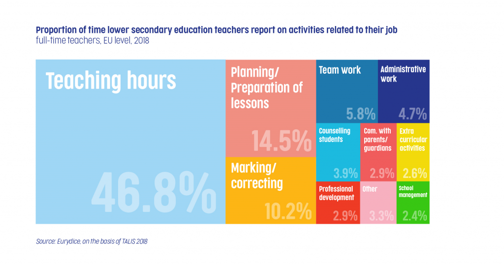 Наставнички рад обухвата много више од држања часова. Припрема наставе, прегледање домаћих задатака и контролних, састанци, извештаји, разне административне процедуре и ваннаставне активности често заузму више од пола радног дана. Подаци из Европе показују да у средњим школама наставници пред таблом проведу у просеку свега 46,8% времена, док остатак одлази на припреме и бирократске послове.